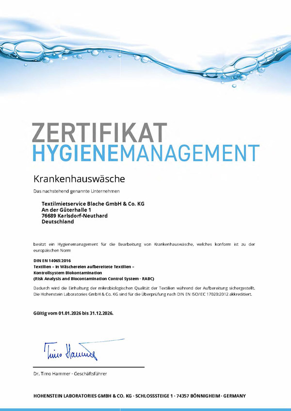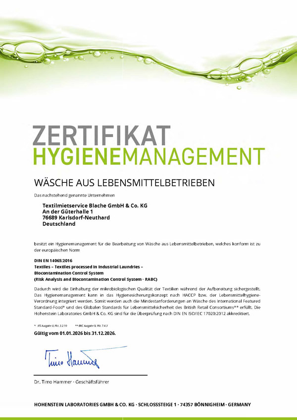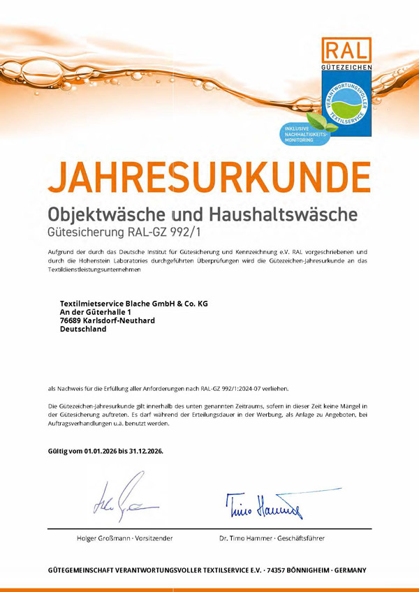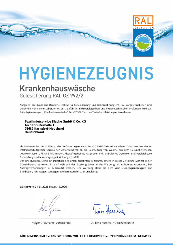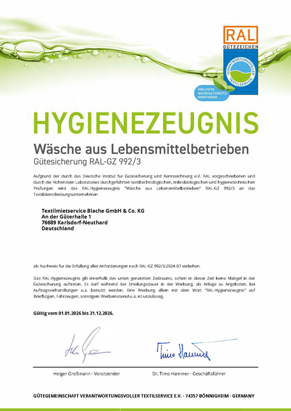 - Hygiene-Zeugnis für Wäsche aus Lebensmittelbetreiben nach Ral-GZ 992/3